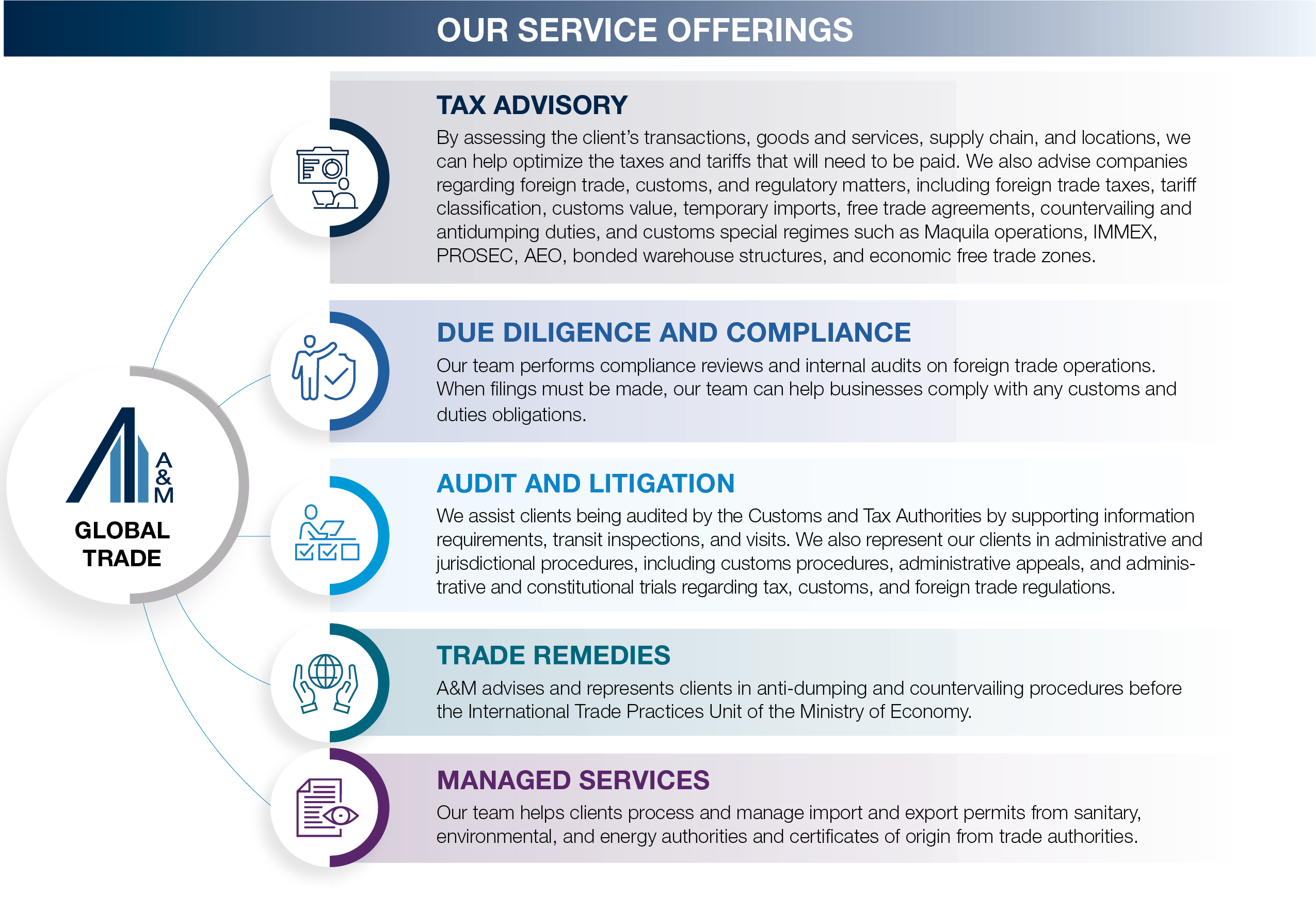 A&M’s Global Trade Services team helps clients navigate complex Mexican trade and customs operations, such as Maquila operations, IMMEX, PROSEC, AEO, bonded warehouse structures, and free trade agreements. Our team provides tax advisory services related to global trade transactions, customs, import, and export regulations, and we help clients implement updated supply chain structures and determine the potential tax impacts.