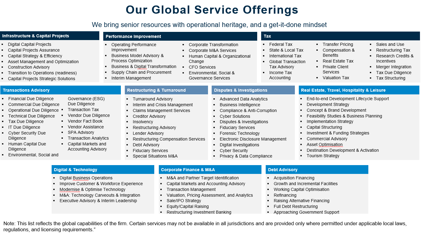 Companies, investors and government entities turn to Alvarez & Marsal (A&M) when conventional approaches are not enough to drive change and achieve results. Privately held since its founding in 1983, A&M is a leading global professional services firm that provides advisory, business performance improvement and turnaround management services. Our senior leaders, and their teams, help organizations transform operations, catapult growth and accelerate results through decisive action. With over 12,000 people across five continents, we deliver tangible results for corporates, boards, investment funds, law firms and government entities facing complex challenges. Comprised of experienced operators, world-class consultants, former regulators and industry authorities, A&M leverages its restructuring heritage to turn change into a strategic business asset, manage risk and unlock value at every stage of growth.