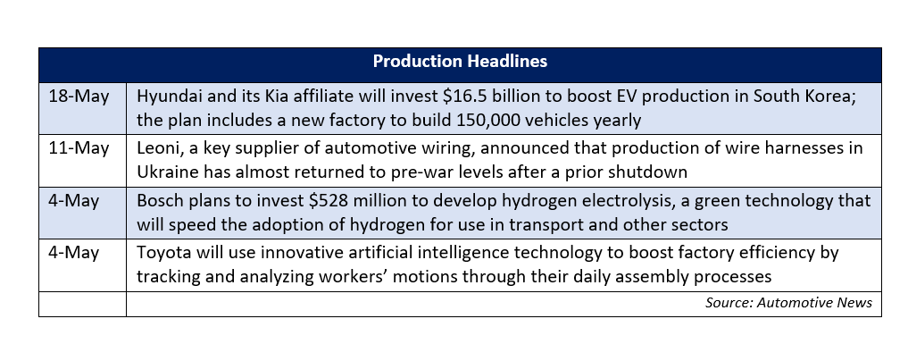 New light vehicle sales in the U.S. declined 22 percent year-over-year in April with a 14.3 million seasonally adjusted annualized rate (SAAR) of sales. April sales represent a month-over-month increase and the highest SAAR year-to-date. However, April sales are likely the product of the heightened inventory levels from March, and not indicative of a near-term uptick in sales as supply remains constrained.
