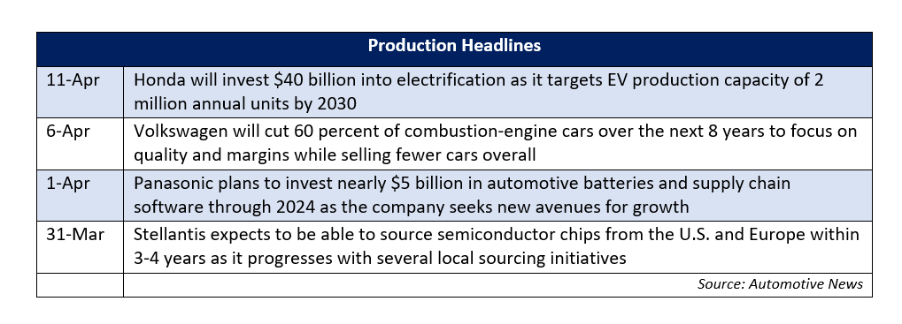 In regulatory news, the U.S. government implemented stricter fuel regulations for vehicles and is seeking to implement policy to enhance domestic chip supply.