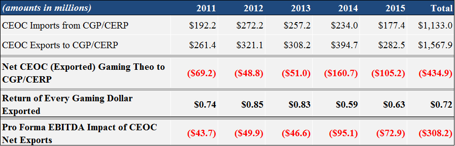 The Theo related observations were then grouped based on (i) the general hub and spoke premise and (ii) by legal entity (i.e., CEOC vs CERP and/or CGP). For example, as shown in Table 1, the regional properties were net exporters of Theo gaming revenue to Las Vegas from 2011 to 2015. The regional properties recovered an average of 53 cents on the dollar of the exported play to the Las Vegas properties.
