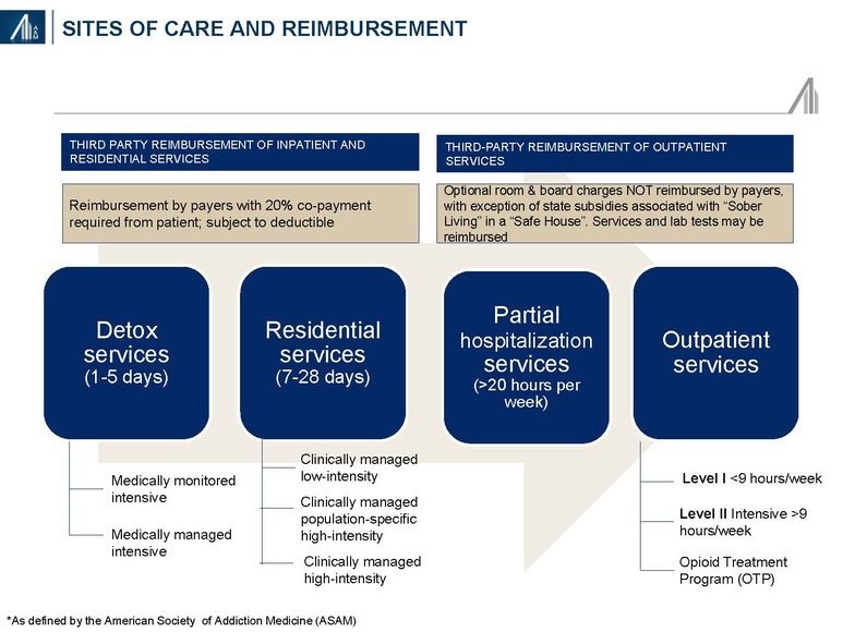 2. Payer mix, service coverage and payment methodology. Among the services provided include detoxification, residential services, partial hospitalization (>20 hours per week in residential setting) and outpatient services. Insurance companies tend to cover detoxification services, assuming medical necessity for <5 days, residential services for 7–28 days and many (but not all) of the services provided as partial hospitalization and outpatient services. Until recently, most insurance companies covered inpatient stays of 28–60 days, excluding room and board charges associated with partial hospitalization and / or outpatient services in a “safe house” (“sober living”), the latter often being the direct (out-of-pocket) payment responsibility of the client. Facilities are often reimbursed on a per diem basis rather than per service.