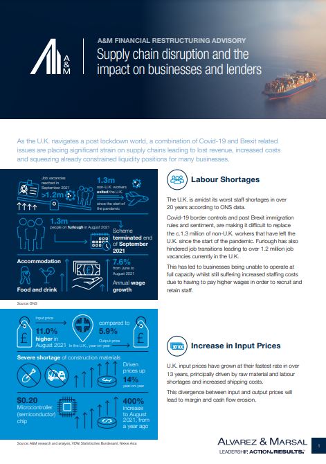 As the U.K. navigates a post lockdown world, a combination of Covid-19 and Brexit related issues are placing significant strain on supply chains leading to lost revenue, increased costs and squeezing already constrained liquidity positions for many businesses.