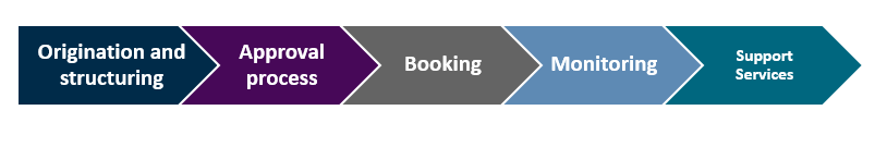 Origination and structuring: This includes key functions regarding relationship management, and sourcing/identifying customers. Once the customer has been sourced, the next step is to structure the loan which includes negotiating the contractual terms.