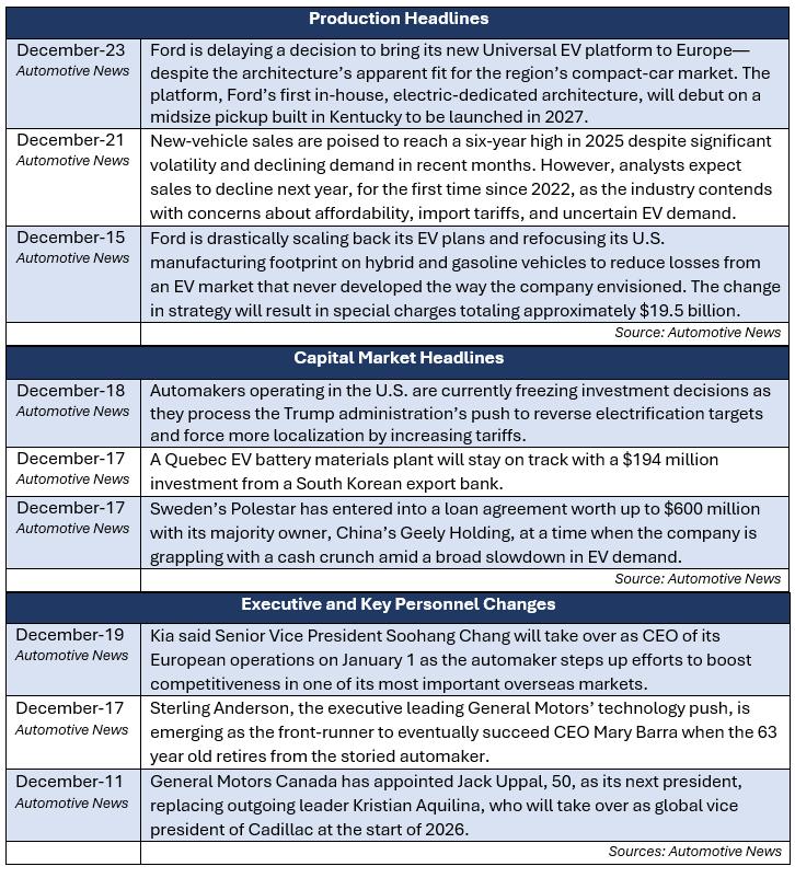 2025 was a year of uncertainty, continuous change, and strategic realignment. EV strategies continued to be dynamic in light of low volumes, policy risk reentered the conversation as tariff impacts materialized, and rapid advancements in artificial intelligence (AI) laid the groundwork for future capabilities.