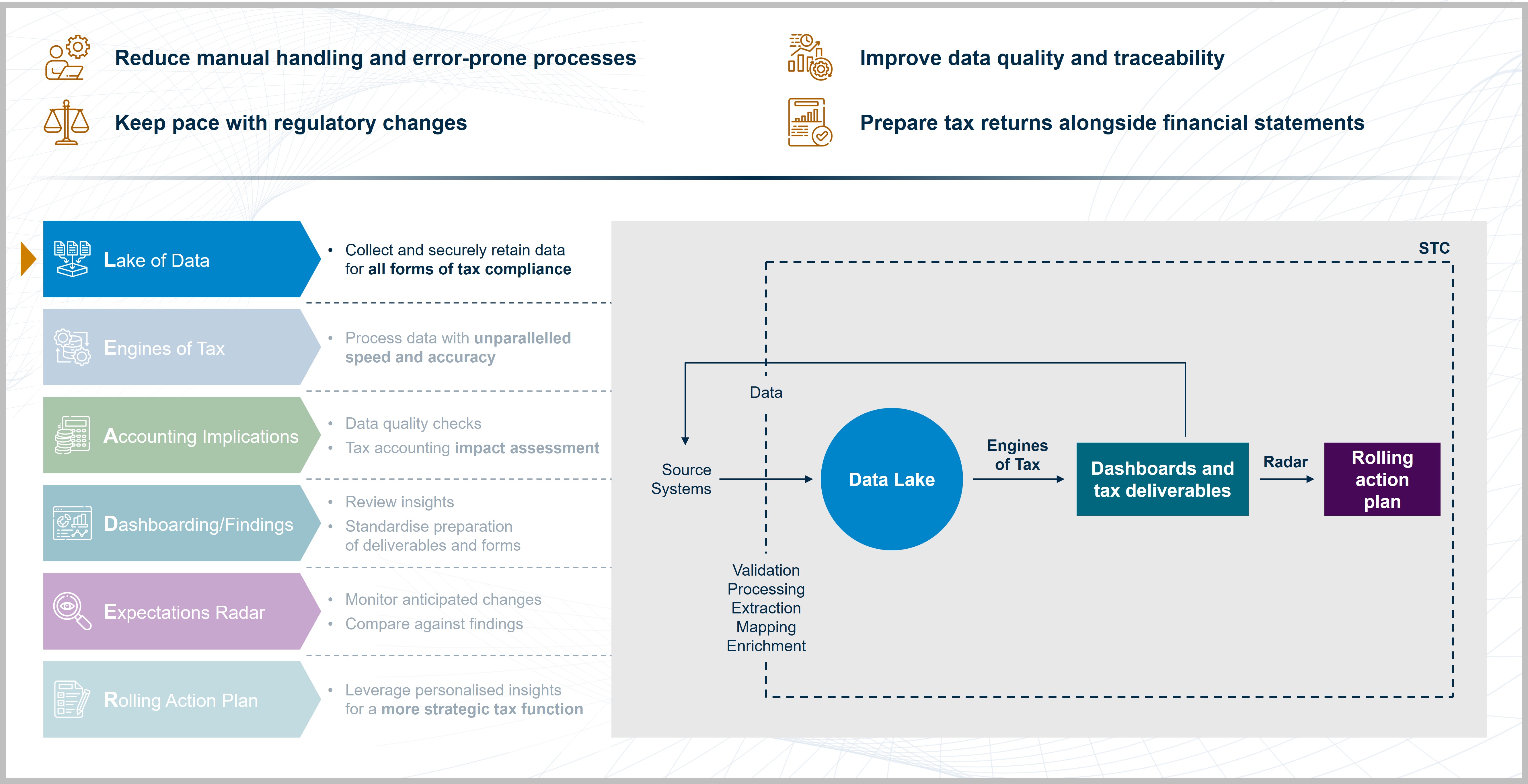 - Empower tax and finance functions to adopt sophisticated, data-driven tools.