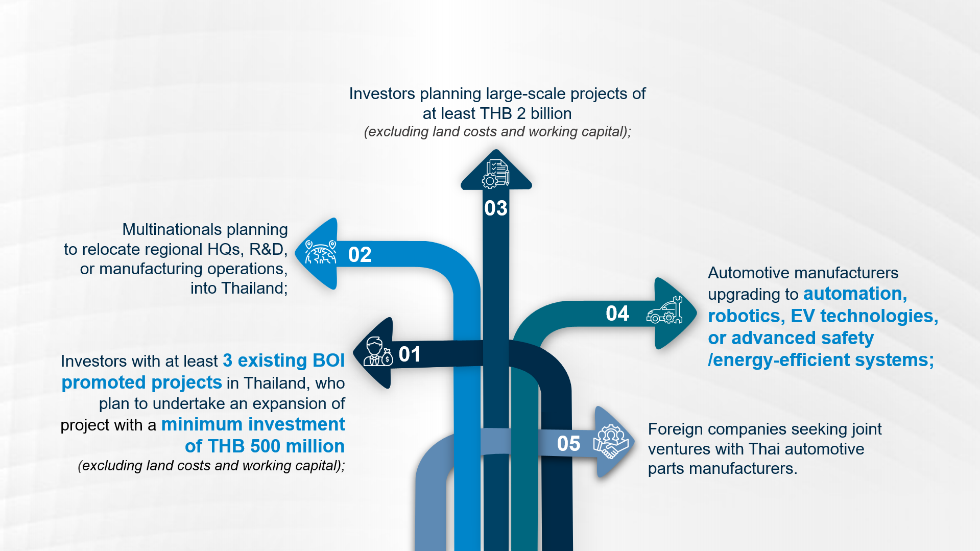 - Expansion projects must have an investment value of at least THB 500 million (excluding land costs and working capital).